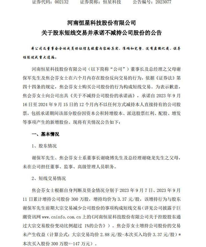恒星科技表示,焦会芬增持公司股份不具有短线交易的主观故意,上述短线交易未产生收益,且收到公司通知后立即停止增持行为。该事项发生后,其已深刻认识到本次事项的严重性,因本次交易带来的不良影响致以诚挚的歉意,并承诺12个月内不以任何方式减持本人所直接持有的公司股票。
