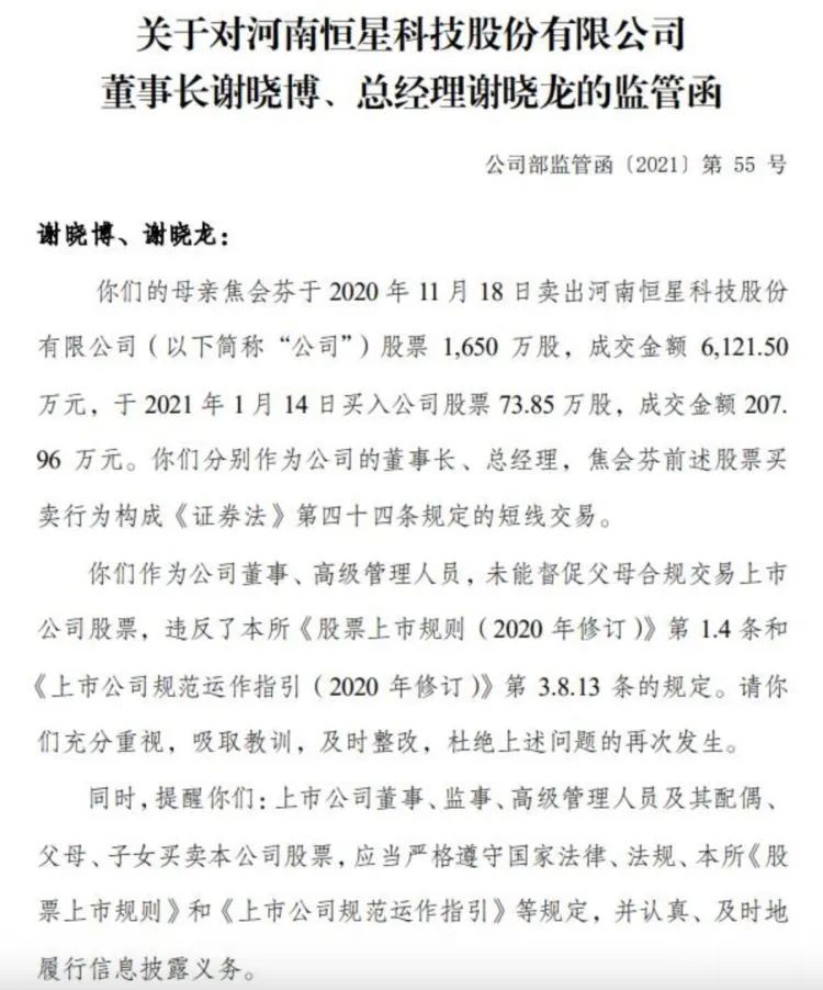2021年6月7日,深交所官网披露,恒星科技董事长谢晓博、总经理谢晓龙的母亲焦会芬于数月之前构成短线交易。