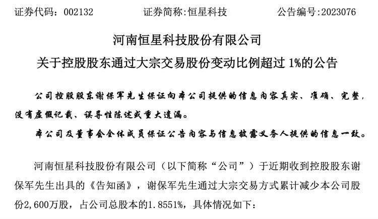 同日,恒星科技公告称,近期收到控股股东谢保军出具的《告知函》,谢保军通过大宗交易方式累计减少本公司股份2600万股,占公司总股本的1.8551%。减持后,谢保军持有公司17.1188%的股份。