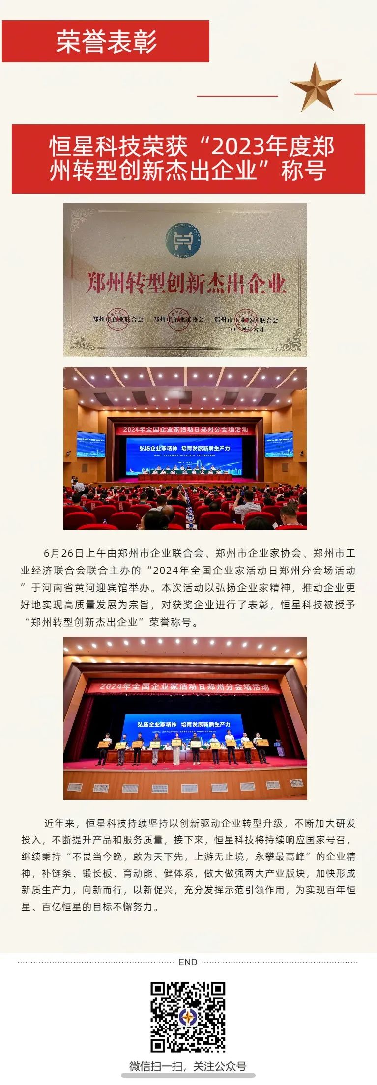 恒星科技荣获“2023年度郑州转型创新杰出企业”称号