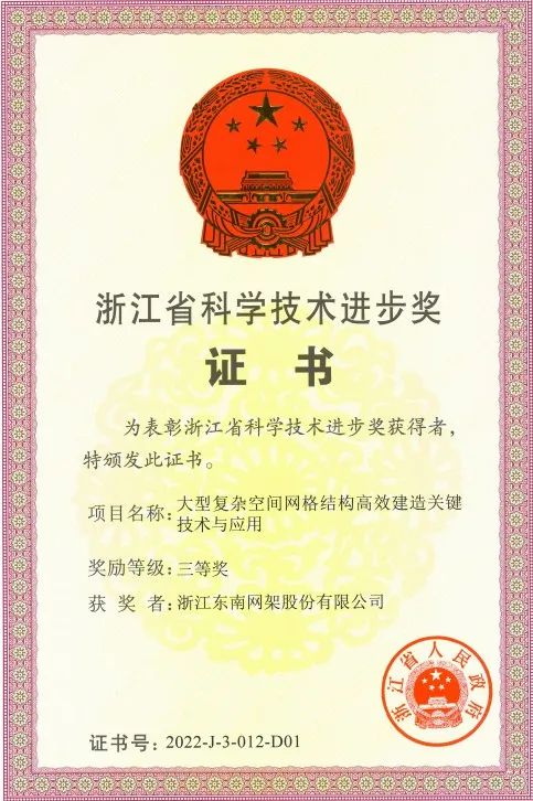 近日,浙江省创新深化大会在省人民大会堂举行,省科技厅公布2022年度浙江省科学技术奖获奖名单。东南网架作为主要单位申报的“大型复杂空间网格结构高效建造关键技术与应用”成果,荣获2022年度浙江省科学技术进步奖三等奖。