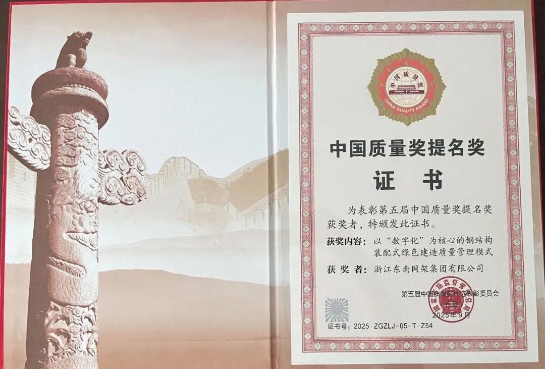 9月16日,在由国家市场监管总局与江苏省人民政府共同主办的2025年中国质量大会上,浙江东南网架集团有限公司凭借其独创的“以数字化为核心的钢结构装配式绿色建造质量管理模式”荣获第五届中国质量奖提名奖,具有里程碑意义!