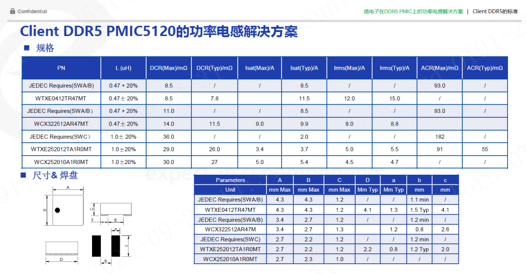 此外,由于DDR5的供电架构也发生了重大变化,由之前的多相大电流集中供电变为双相较小电流分布供电。这一架构变化深刻影响了电感形态,使得电感形态由大尺寸大电流组装式演变为小尺寸薄型化,且具有非常小的损耗要求。