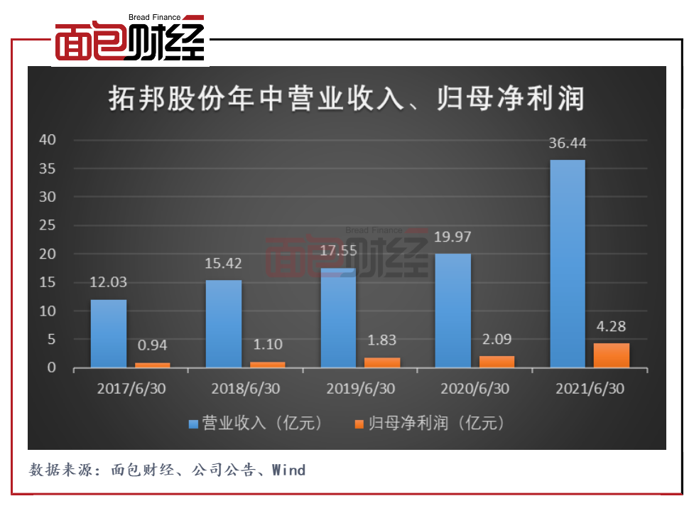 拓邦股份的主营业务为智能控制系统解决方案的研发、生产和销售,面向家电、工具、工业和新能源四大行业提供各种定制化解决方案。近三年上半年,公司收入和归母净利润的复合增速分别达到44.10%和52.89%。