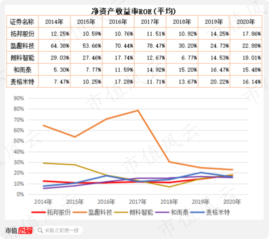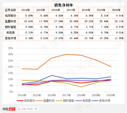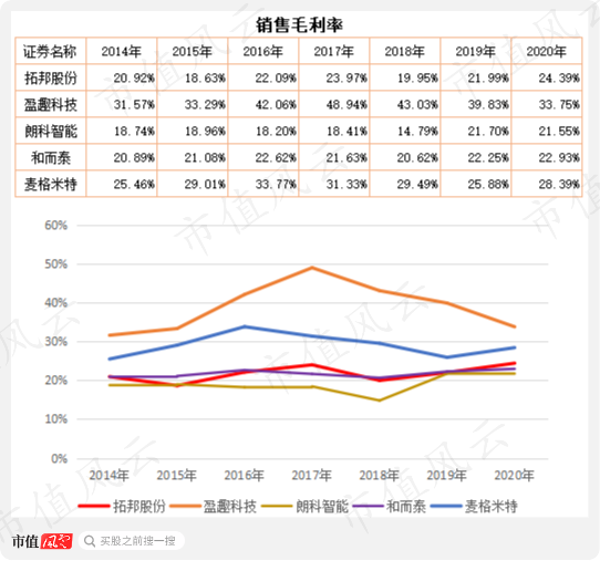 5家公司中,盈趣科技的毛利率最高,一度接近50%,2020年在34%左右;麦格米特的毛利率略高于拓邦股份、和而泰以及朗科智能。后三家公司的毛利率比较接近。