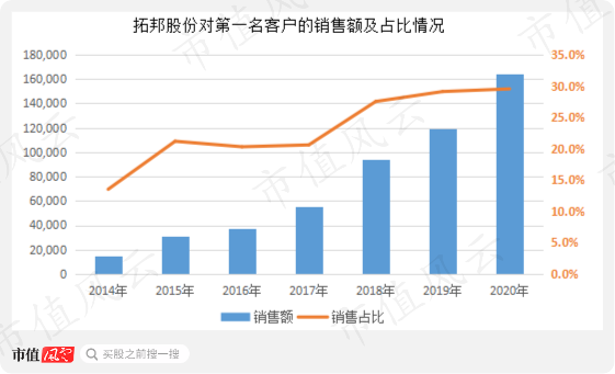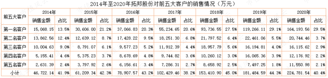 进一步分析拓邦股份对前五大客户的销售情况发现,其对前五,尤其是第一大客户存在较大的依存情况。
