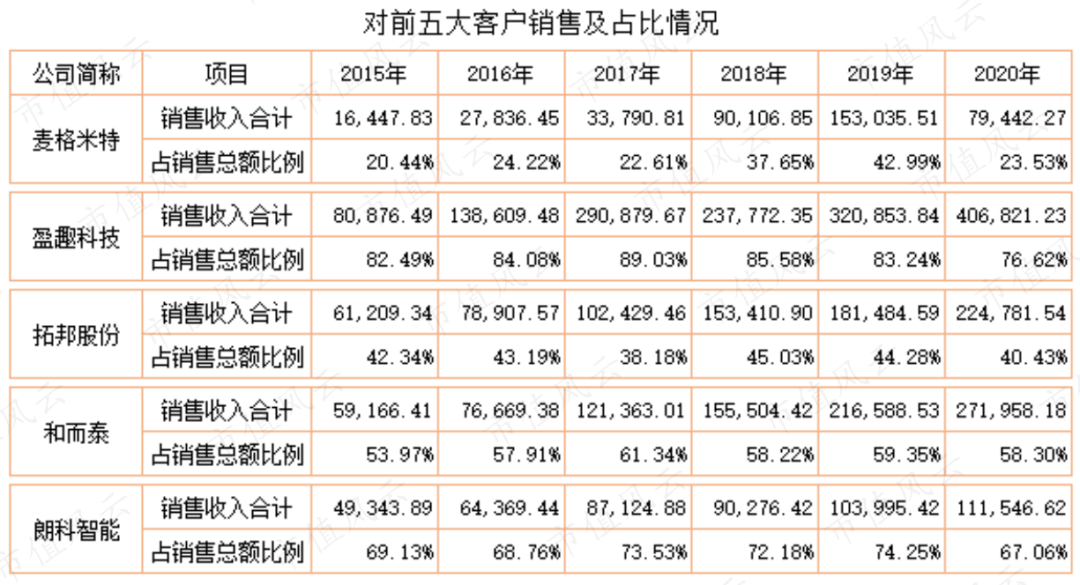 5家公司中对前五大客户依存度最低的是麦格米特,2020年对前五大客户的销售占比不到24%。