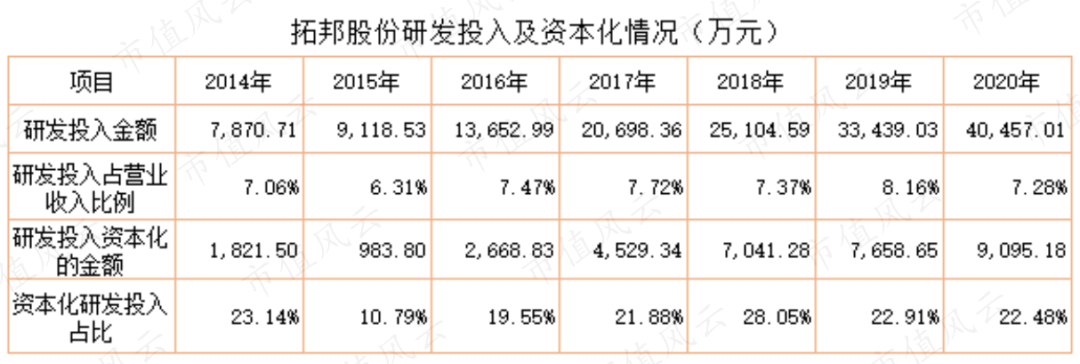 比较有意思的是,拓邦股份与和而泰是最为直接的竞争对手,但前者的研发投入在2016年至2019年期间均是后者的两倍。