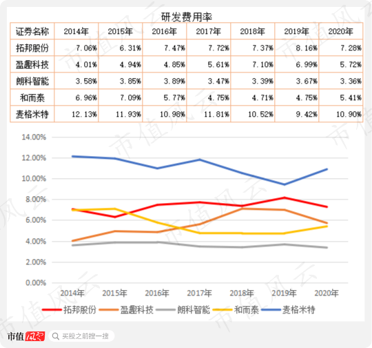 麦格米特的研发费用最高,在10%上下,其次是拓邦股份,2016年以来保持在7%以上。