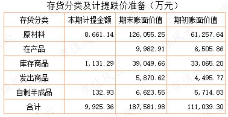 从其分类来看,原材料是存货中占比最大,截止6月底的账面价值为12.61亿元,较年初的6.1亿元增加了一倍。