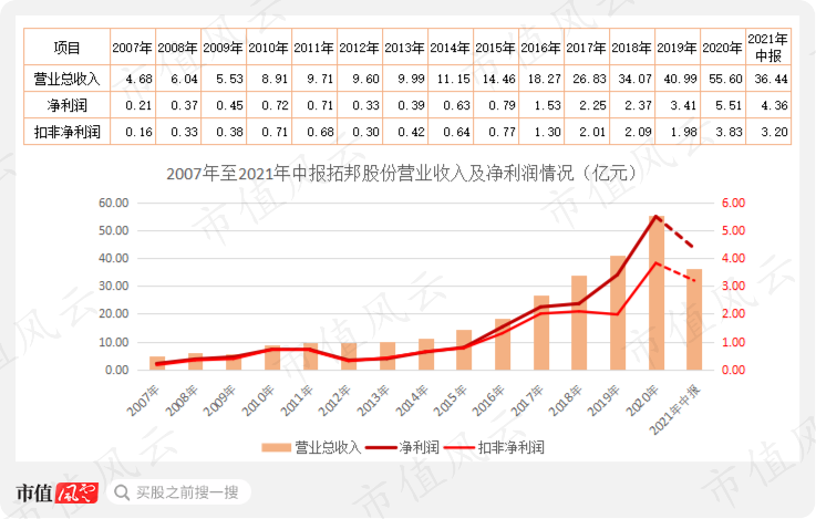 自2007年上市后,营收规模和利润双双快速发展:营业收入从上市初的4.7亿元增长到2020年的55.6亿元,增长了近12倍;同期净利润也从2100万元增至5.5亿元,增长了26倍。