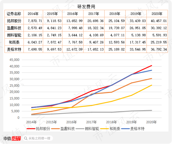 本文提及的5家公司中研发投入金额最高的是拓邦股份和麦格米特,盈趣科技、和而泰排第三、第四。