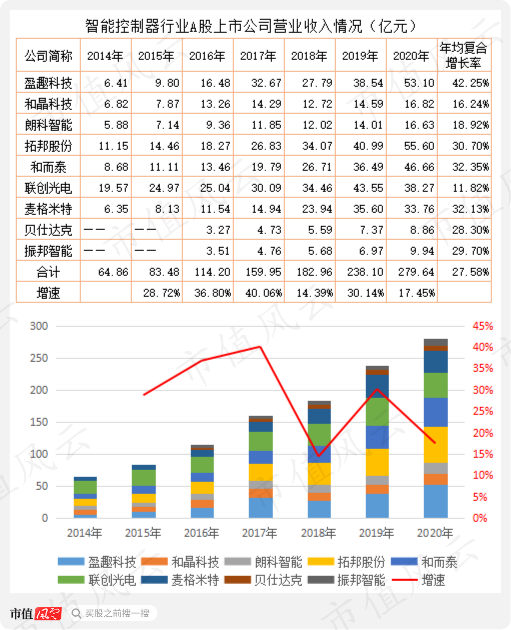 据不完全统计,目前智能控制器行业在A股上市的公司至少有9家(最近两年智能控制器业务收入占比50%以上);2014-2020年的营业收入年均复合增长率大部分公司在30%或以上,其中盈趣科技、拓邦股份、和而泰、麦格米特等公司在均超过30%。