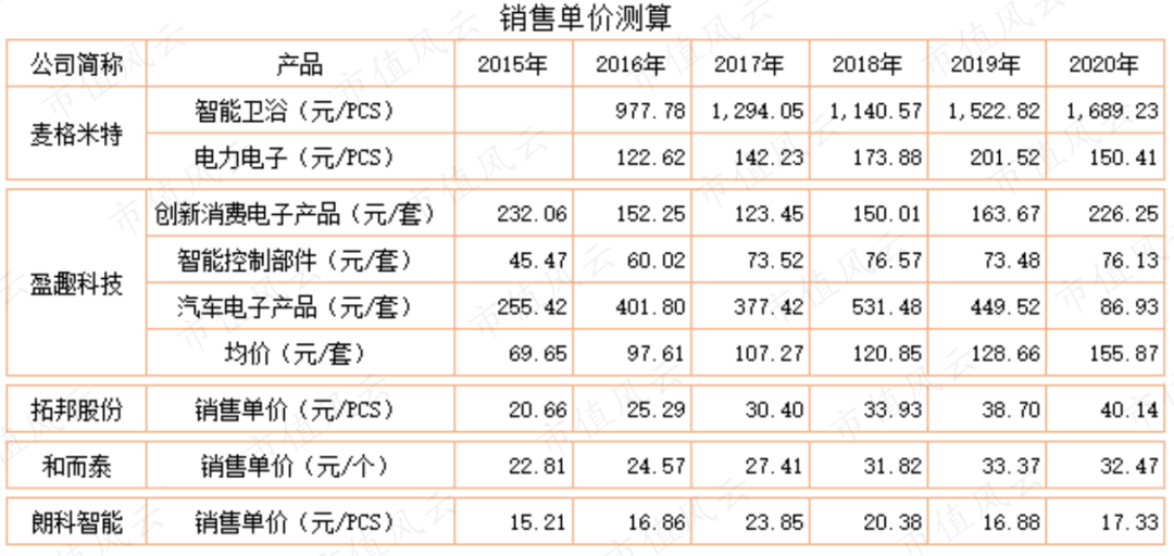 朗科智能产品主要是电动工具、家用电器、智能电源等三大类的智能控制器,综合销售单价是5家公司中最低的,最近两年的销售单价均不到20元/PCS。