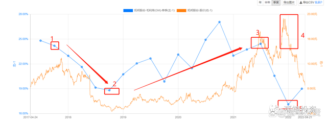 回归过去或许可以找出公司周期的表现,因为两轮影响公司净利润下滑的主要因素是原材料价格上涨,进而影响毛利率,那是不是可以对比股价走势和毛利率走势找出相同点呢?看下图: