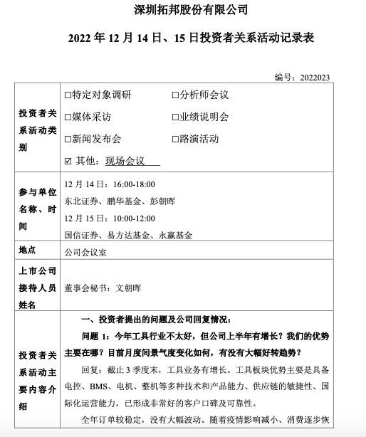 深圳拓邦股份有限公司(以下简称“拓邦股份”或“公司”)12月16日晚间发布公告称,公司于12月14日、15日与多家机构投资者进行了现场会议。会议中,拓邦股份透露,公司全年订单较稳定,没有大幅波动。随着疫情影响减小、消费逐步恢复,海外工厂开始投产,预期明年工具板块会恢复增长。公司将聚焦大家电几个重点行业做大拳头产品,明年随着消费的逐步恢复、品类的拓展,小家电有望恢复增长。