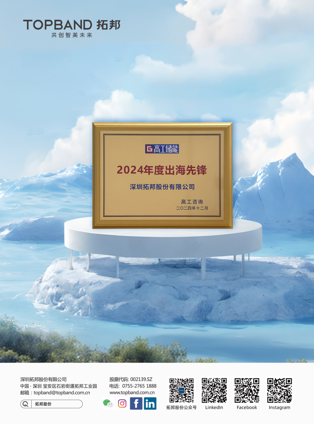 2024年12月,备受瞩目的2024高工储能年会暨高工金球奖颁奖典礼在深圳隆重举行,拓邦股份凭借在储能领域的技术创新成果和全球制造供应链的显著优势,荣获“2024 高工金球奖——年度出海先锋”奖项。这项荣誉不仅是对拓邦股份在储能领域海外成就的认可,更是对其在推动储能行业全球化和绿色低碳发展中所作出贡献的肯定。