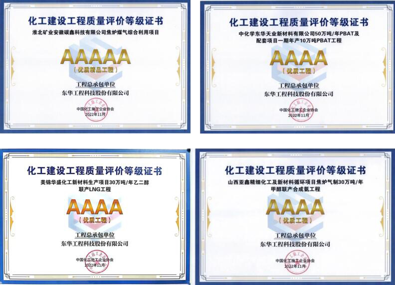 近日,中国化工施工企业协会公布2022年化工建设工程质量评价结果,东华科技四个项目获奖。其中,淮北矿业安徽碳鑫科技有限公司焦炉煤气综合利用项目获2022年化工建设工程质量评价5A级项目(化学工业优质精品工程),中化学东华天业新材料有限公司50万吨/年PBAT及配套项目一期年产10万吨PBAT工程、美锦华盛化工新材料生产项目30万吨/年乙二醇联产LNG工程、山西亚鑫精细化工及新材料循环项目焦炉气制30万吨/年甲醇联产合成氨工程获2022年化工建设工程质量评价4A级项目(化学工业优质工程)。