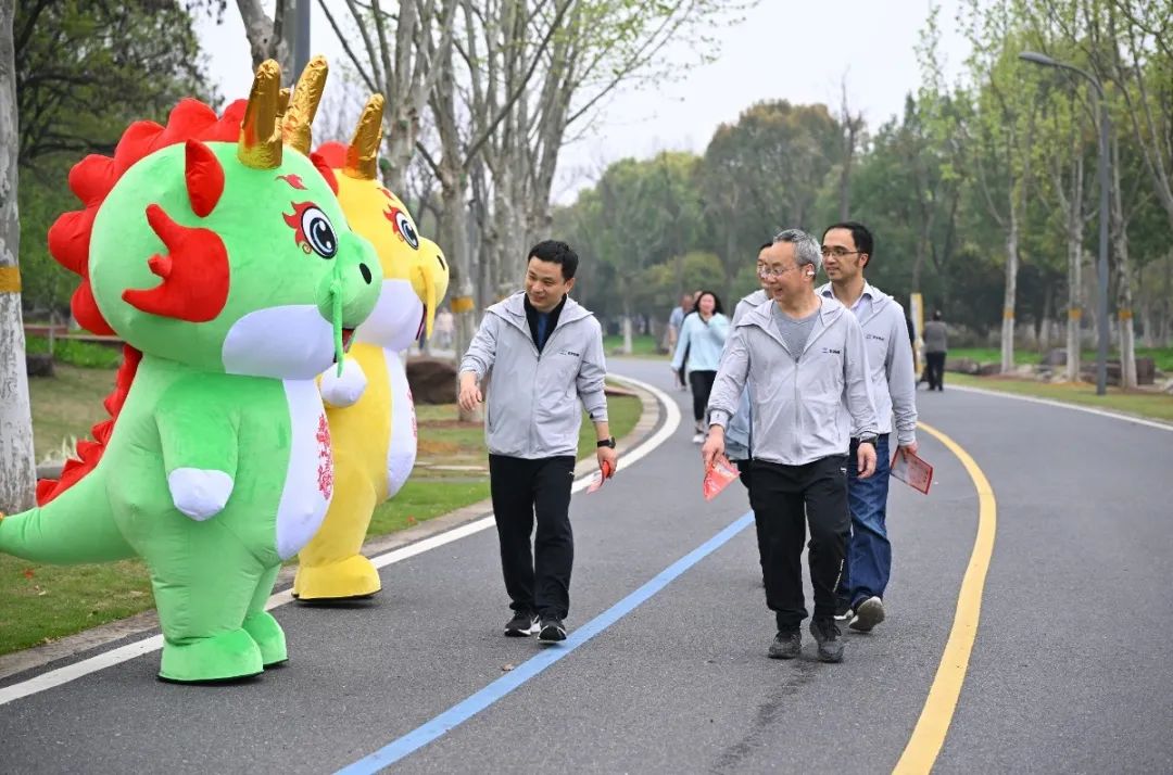 活动现场热闹非凡,志愿者和工作人员井然有序地穿梭在竞技区和环湖赛道区,为选手提供讲解、指引和帮助。竞技区选手摩拳擦掌,期望在为团队赢得积分的同时提高个人比赛名次;环湖赛道的选手三两成行,在观赏春景的同时谈笑风生,不时与赛道附近出现的龙形玩偶合影留念,展现出积极向上的精神风貌。