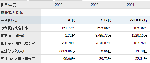 目前,该公司并未发布2024年年度报告。不过,1月28日发布的《2024年度业绩预告》显示,预计2024年度利润总额亏损1.05亿-1.36亿元,归母净利润亏损0.94亿-1.15亿元,扣除非经常性损益后的净利润亏损1.12亿-1.3亿元,三者均为负值。营业收入3.5亿-4.55亿元,扣除与主营业务无关的业务收入和不具备商业实质的收入后的营业收入为3.4亿-4.4亿元。根据公告,按照退市新规,若公司2024年度扣除后营业收入经审计后低于3亿元,将会被终止上市;反之,若公司2024年度经审计的扣除后营业收入不低于3亿元,且不存在其他需要实施退市风险警示的情形,则有望摘“帽”。