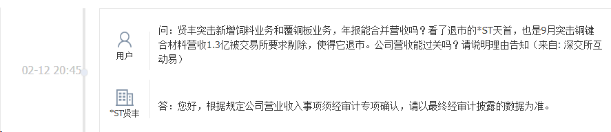 那么,*ST贤丰在2024年增加的覆铜板业务和动物营养(饲料)业务是公司探索新的业务转型的一个方向吗?相关工作人员表示:“我们只能说现在确实新增了这块业务,有了收入,也是说有这方面转型。但是……我们也在公告上充分提示了,这块收入能不能计入主营,最后以会计师和监管部门的意见为准。”