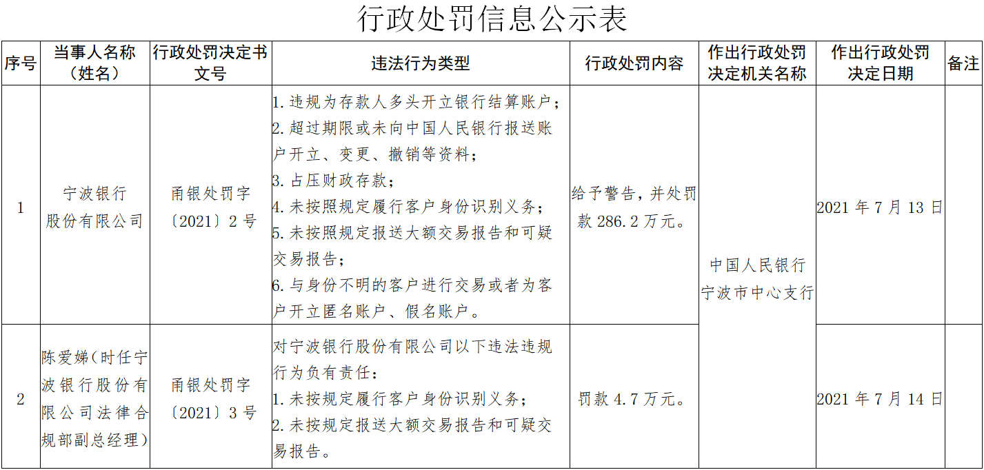 7月21日,中国人民银行宁波中心支行发布行政处罚公告,宁波银行因违反多项反洗钱规定收到总额286.2万元罚单。