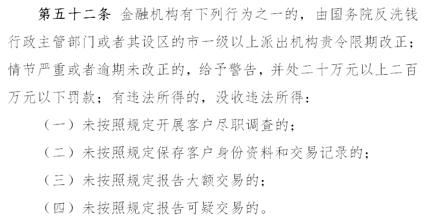 其中,第五十二条规定,金融机构存在未按照规定开展客户尽职调查的、未按照规定保存客户身份资料和交易记录的、未按照规定报告大额交易的、未按照规定报告可疑交易的等行为的,由国务院反洗钱行政主管部门或者其设区的市一级以上派出机构责令限期改正;情节严重或者逾期未改正的,给予警告,并处二十万元以上二百万元以下罚款;有违法所得的,没收违法所得。