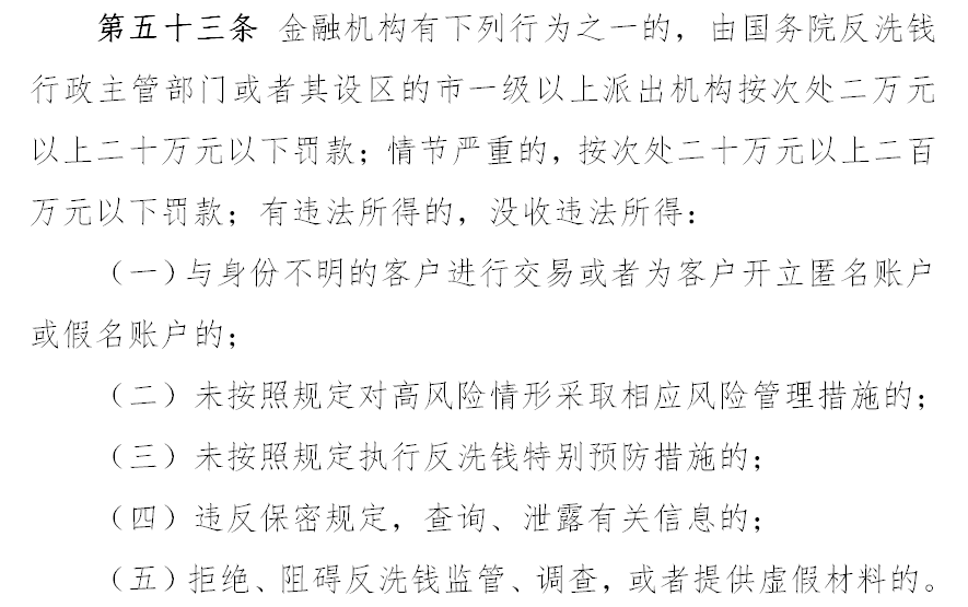 另外,第五十三条规定,金融机构存在与身份不明的客户进行交易或者为客户开立匿名账户或假名账户等五项行为的,由国务院反洗钱行政主管部门或者其设区的市一级以上派出机构按次处二万元以上二十万元以下罚款;情节严重的,按次处二十万元以上二百万元以下罚款;有违法所得的,没收违法所得。