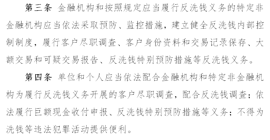 6月1日,中国人民银行发布《中华人民共和国反洗钱法(修订草案公开征求意见稿)》明确,金融机构、特定非金融机构应当依法采取预防、监控措施,建立健全反洗钱内部控制制度,履行客户尽职调查、客户身份资料和交易记录保存、大额交易和可疑交易报告、反洗钱特别预防措施等反洗钱义务。