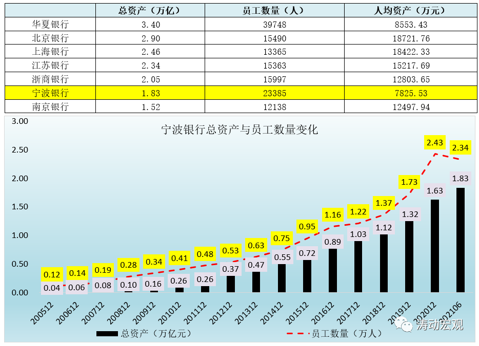 特别是,和2万亿左右的银行相比,宁波银行员工数量是最多的,人均资产则最低。例如,宁波银行的员工数量达到23385人,基本是北京银行、上海银行、江苏银行与浙商银行等员工数量的1.50倍。