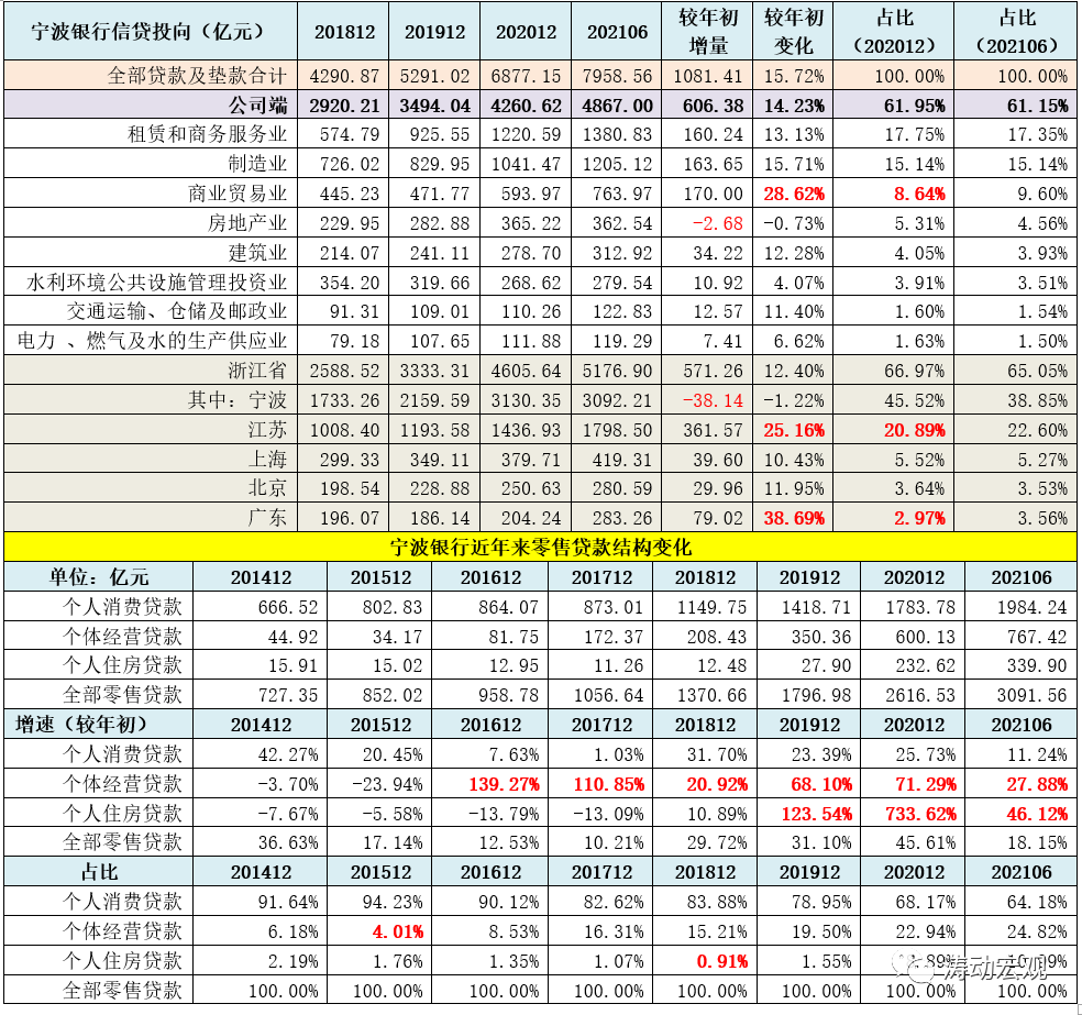 1、2016年开始,宁波银行不断加大个体经营贷款的投放力度,个体经营贷款规模从2015年的34.17亿元增长至2021年6月底的767.42亿元,年均增幅高达76.08%,在零售贷款中的占比由2015年的4.01%大幅提升至目前的24.82%。