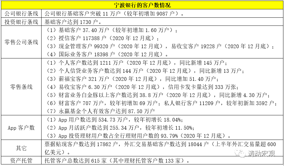 经过一系列努力,目前宁波银行的客户数已经实现了较快成长,并取得了不错成效,其公司银行和投行的基础客户数分别达到11万户和1730户,而其财富客户达到707万户(较年初增加69万户)、私行客户达到11209户(较年初增加3592户)、托管客户数达到615家(理财托管客户数达到133家)。