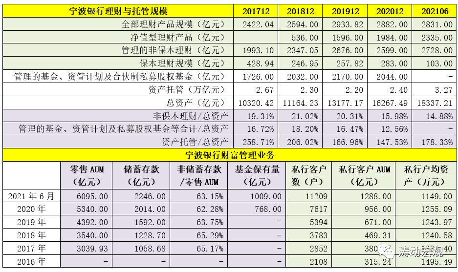 3、截至2021年6月,宁波银行零售AUM达到6095亿元(较年初增加755亿元)、私行客户AUM达到1288亿元(较年初增加332亿元)。其中,在在宁波银行零售AUM的构成中,非储蓄存款占比高达63.15%。