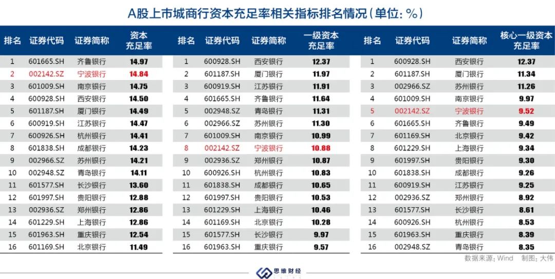 据统计,在A股上市的16家城商行中,宁波银行的资本充足率相关指标排名靠前,其核心一级资本充足率排名第二,仅次于年内上市的齐鲁银行。