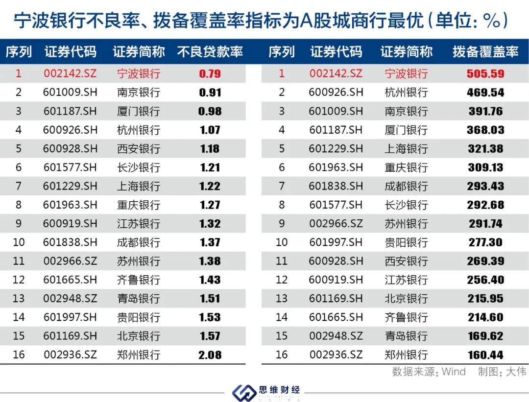 数据显示,2008年以来,宁波银行不良率从未超过1%,截至今年三季度末,该行不良率为0.79%,拨备覆盖率为505.09%,两项指标在A股城商行中为最优。