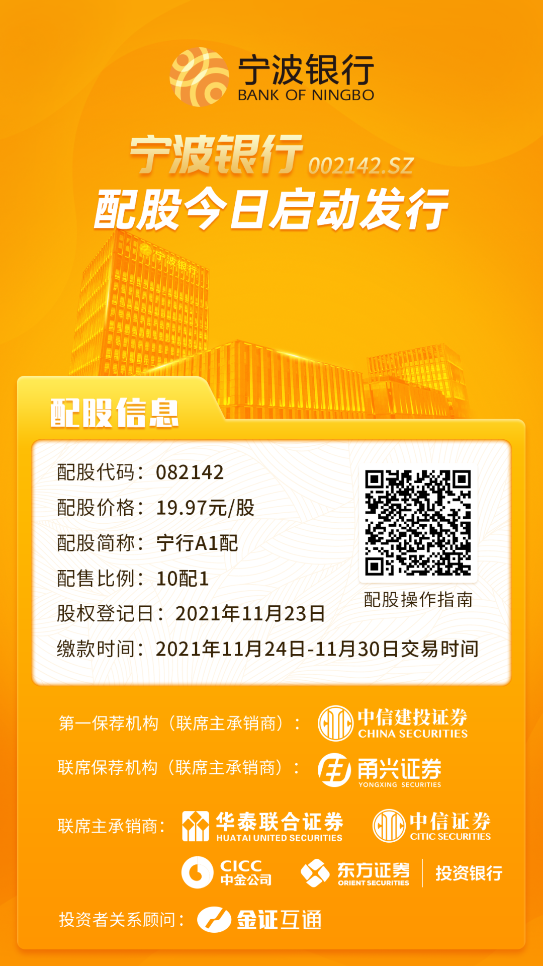 11月18日晚间,宁波银行发布公告,将在11月23日收市后,向中国结算深圳分公司登记在册的公司简报A股股东进行配售,11月24日(R+1日)起至2021年11月30日(R+5日)的交所正常交易期限,到期深期未缴款者自愿放弃配股认购权。
