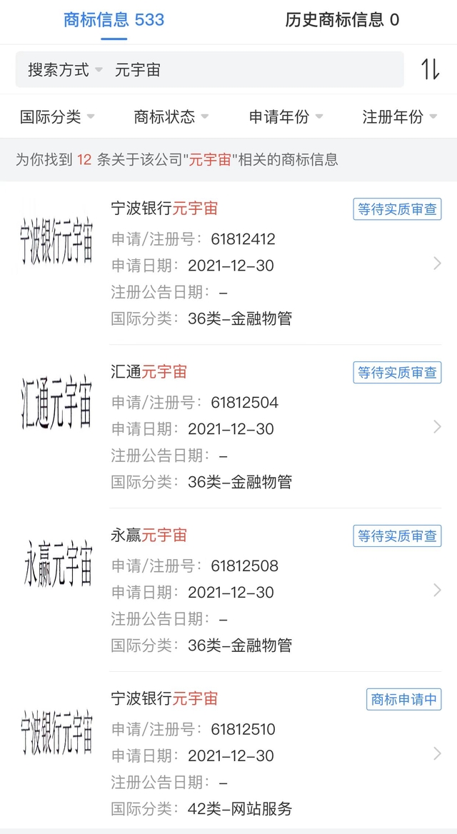 日前,宁波银行股份有限公司申请注册多个元宇宙相关商标,包括“宁波银行元宇宙”“汇通元宇宙”“永赢元宇宙”,国际分类为金融物管,目前商标状态为商标申请中或等待实质审查。据了解,“汇通”商标多应用在宁波银行信用卡,而“永赢”商标则应用于宁波银行旗下金融租赁公司。