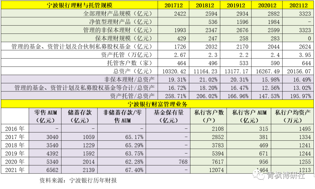 1、截至2021年底,宁银理财管理规模达到3322亿元(占同期表内总资产的比例达到16.49%),同期实现净利润4.35亿元。数据上看,目前宁波银行应该已经将理财规模全部转移至宁银理财旗下。