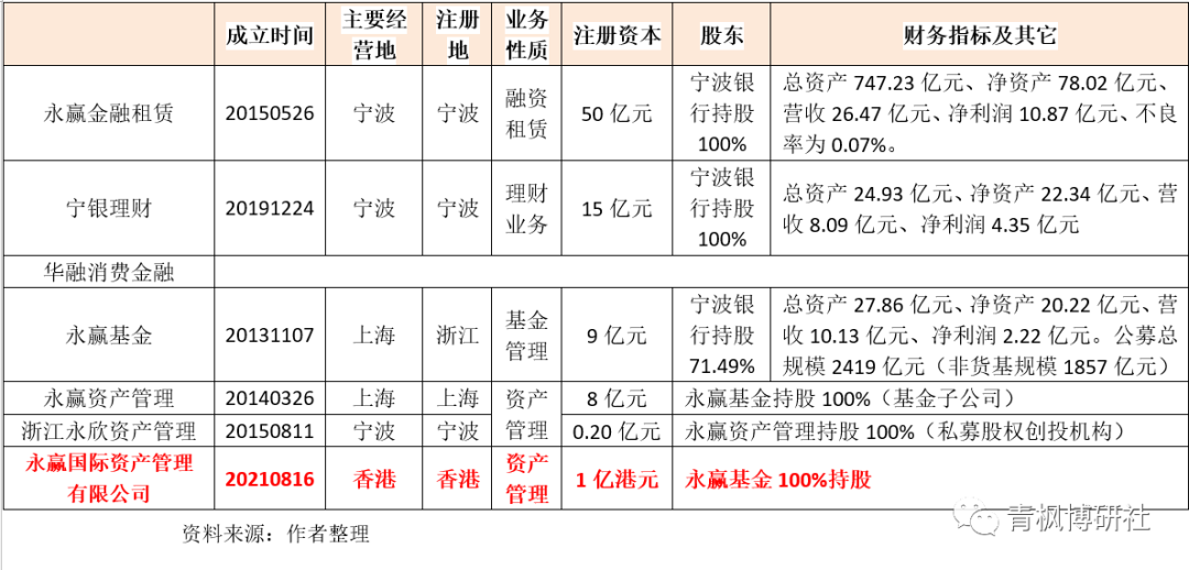 1、2021年8月16日,证监会批复同意永赢基金在香港全资设立永赢国际资产管理,意味着宁波银行通过永赢基金实现了在香港的布局。