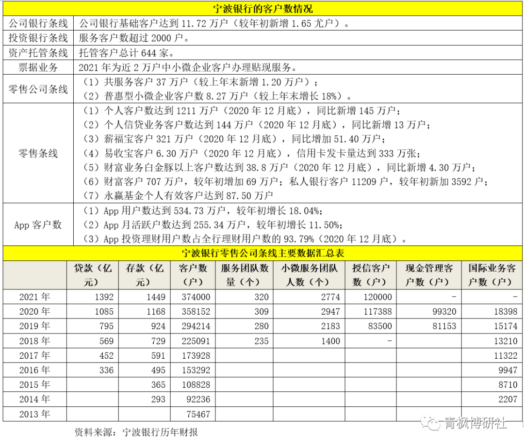 目前宁波银行的客户数已经实现了较快成长,并取得了不错成效,其公司银行客户数分别达到11.72万户(同比新增1.65万户)、投行业务服务客户超2000家、私行客户达到12974户(较年初增加5357户)、托管客户数达到644家。