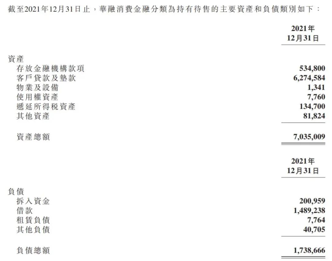 截至2021年12月31日止,华融消费金融分类为持有待售的主要资产总额为70.35亿元,负债总额为17.39亿元。