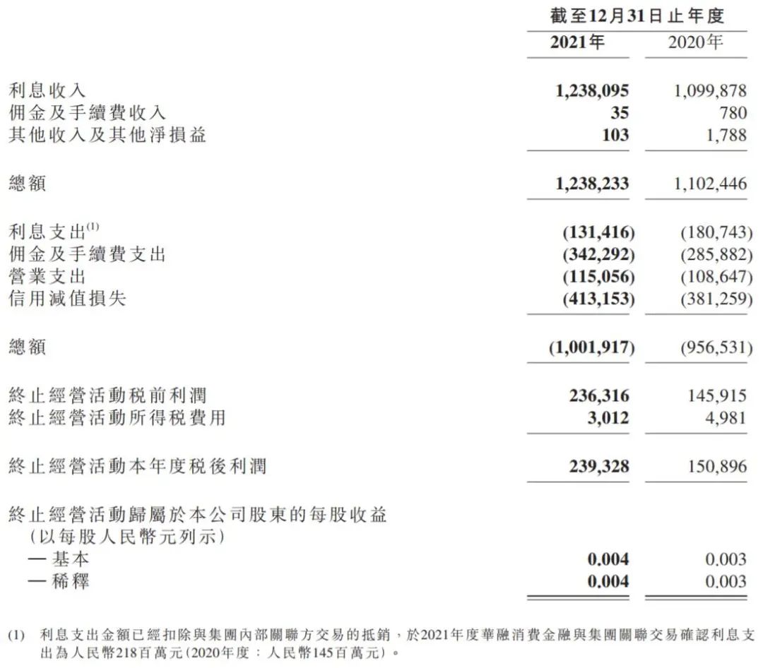 据金融虎APP了解,2021年度,华融消费金融佣金及手续费收入仅3.5万元,2020年度则为78万元;其他收入及其他净损益为10.3万元,2020年度则为178.8万元。税前利润为2.36亿元,较2020年度的1.46亿元同比增长61.6;税后利润为2.39亿元,较2020年的1.51亿元同比增长58.3%。