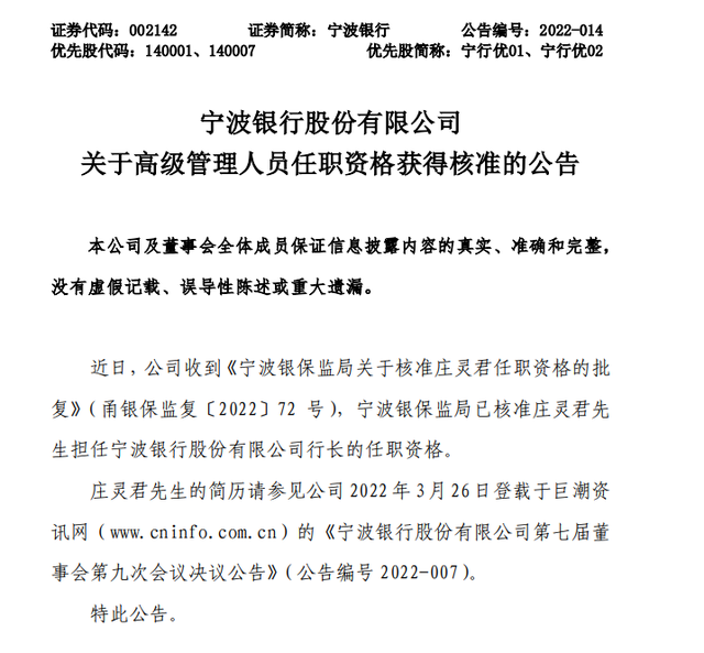 4月13日,宁波银行发布公告称,宁波银保监局已核准庄灵君担任行长的任职资格。