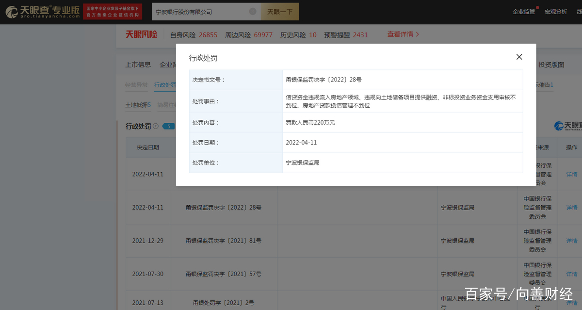 据天眼查APP显示,今年4月18日,宁波银保监局行政处罚信息公开表显示,宁波银行股份有限公司因代理保险销售不规范及信贷资金违规流入房地产领域、违规向土地储备项目提供融资、非标投资业务资金支用审核不到位、房地产贷款授信管理不到位。
