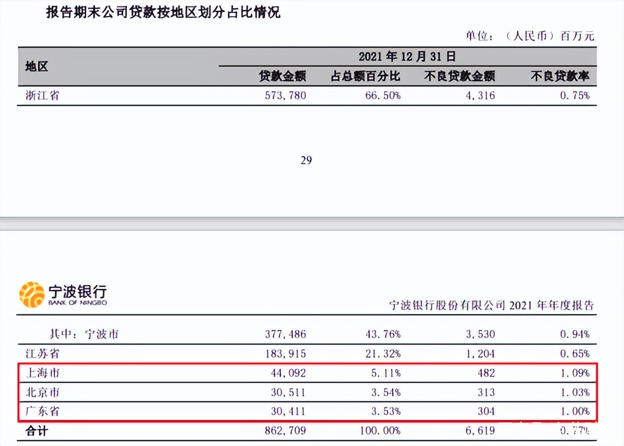 而值得一提的是,虽然2021年宁波银行整体的不良贷款率从上年末的0.79%下降至0.77%,但从地区细分来看,宁波银行在北上广三地的不良率却达到了1%。而在2021年,宁波银行投向上海、北京和广东等地的贷款合计占比约12%。