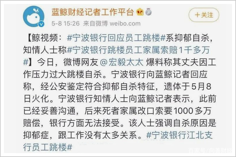 而更令人遗憾的是,在同年的10月,财经网报道,宁波银行萧山支行一客户经理跳楼,这是2020年宁波银行第二个跳楼的员工。