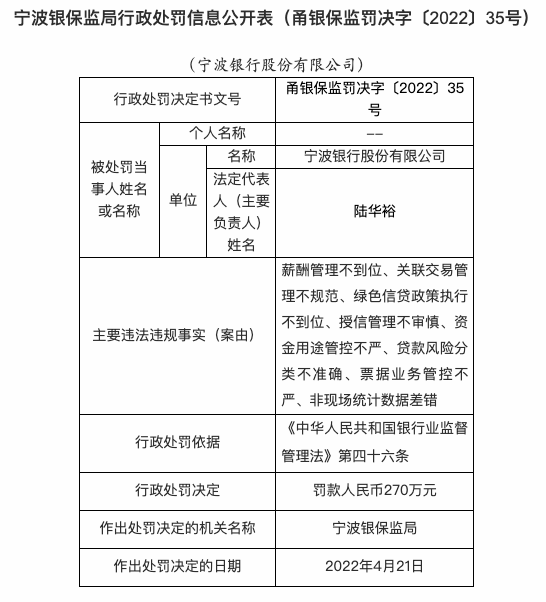 银保监会网站消息,宁波银保监局公布的行政处罚信息公开表显示,4月21日,宁波银行股份有限公司因薪酬管理不到位、关联交易管理不规范、绿色信贷政策执行不到位、授信管理不审慎、资金用途管控不严、贷款风险分类不准确、票据业务管控不严、非现场统计数据差错,被处罚款人民币270万元。