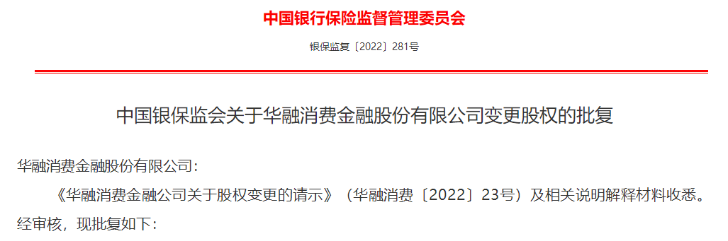 5月6日,银保监会公布行政批复,同意宁波银行受让中国华融持有的华融消金70%股权。