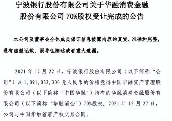 同日晚间,宁波银行发布公告称,截至目前,公司已完成华融消金股权受让的相关事宜,已持有华融消金70%股权。