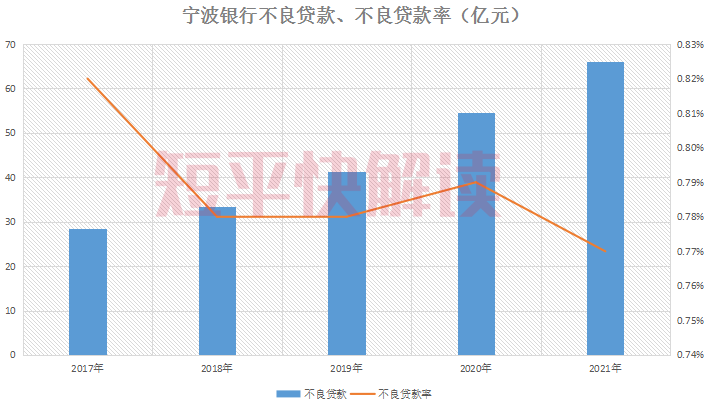 但不容忽视的是,近五年来,宁波银行的不良贷款一直保持快速增长的势头,分别为28.39亿元、33.53亿元、41.41亿元、54.56亿元、66.19亿元。2021年,宁波银行的不良贷款同比增加11.63亿元,增长率达21.32%。